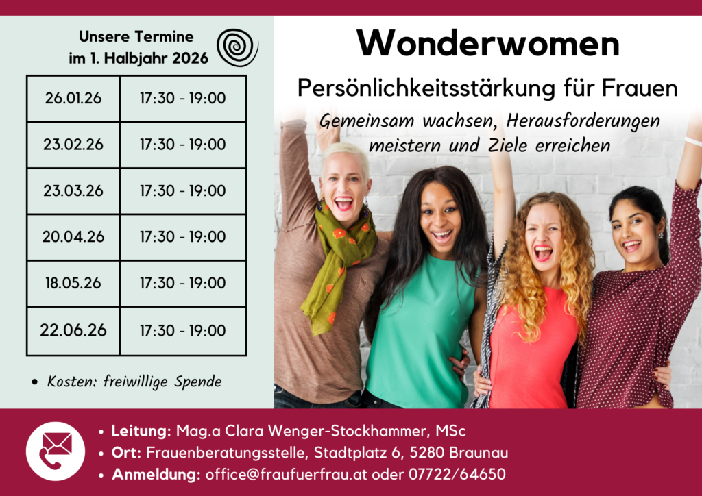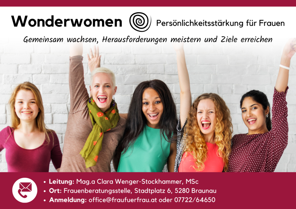 Wir sind alle Wonderwomen – unsere Superheld*innenkräfte zu erkennen und zu nutzen, ist aber nicht immer so einfach. In dieser Gruppe beschäftigen wir uns gemeinschaftlich mit unseren Stärken, Potentialen und Grenzen, decken so manche gesellschaftliche Erwartung auf und unterziehen diese einem Realitätscheck. Wir schauen uns als Expert*innen für die eigene Persönlichkeit unsere alltäglichen Herausforderungen und langfristigen Ziele an und stärken uns mit kollegialen Fallberatungen, Körperübungen und positiver Psychologie für Gegenwart und Zukunft.