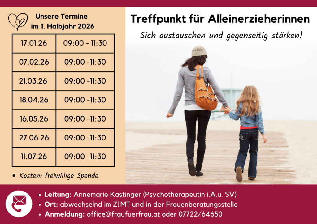 Seit Oktober 2011 treffen sich in der Frauenberatungsstelle Frau für Frau ein Mal monatlich alleinerziehende Frauen zum Erfahrungsaustausch, zur Selbstreflexion, zum gegenseitigen Unterstützen und auch zum Spaß haben.